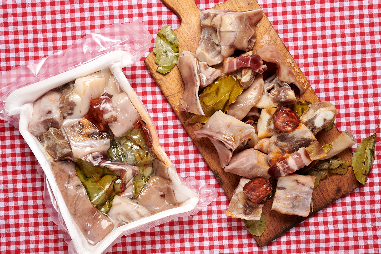 Composição: costela suína salgada, salsichas, pé salgado e rabo salgado de porco